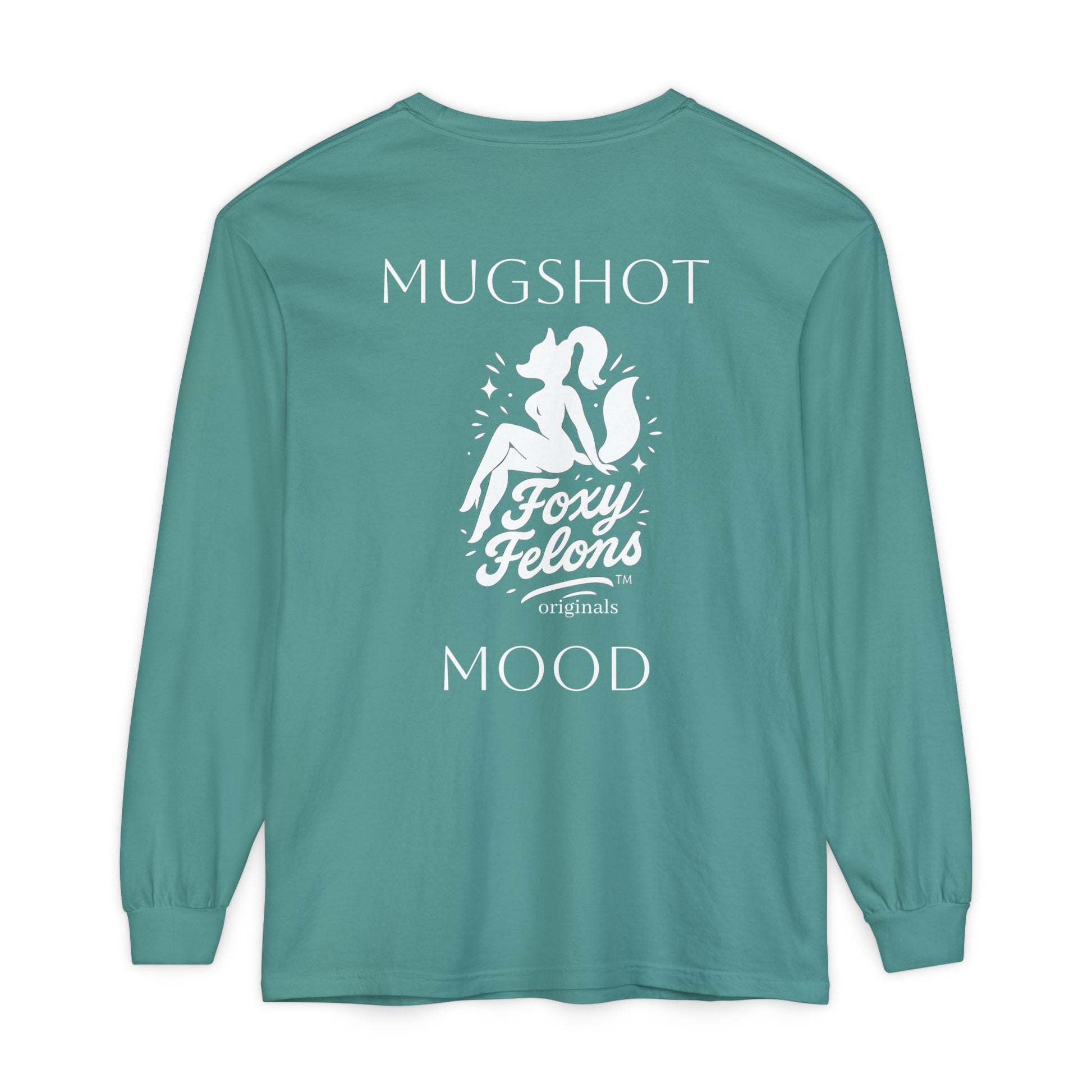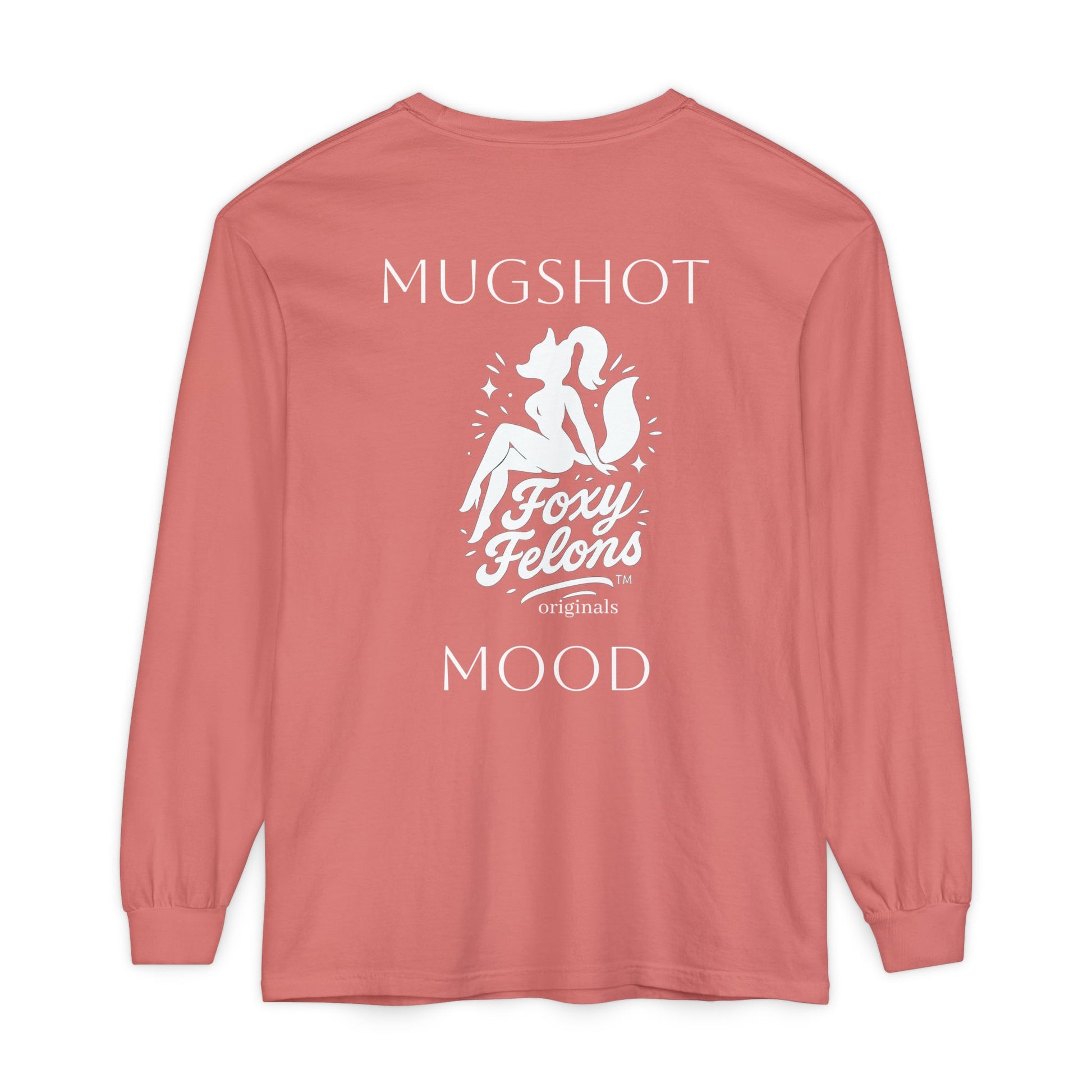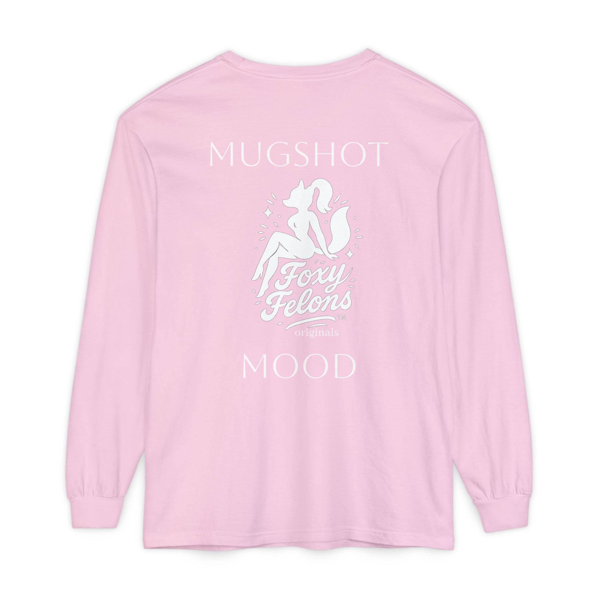 This long-sleeve garment feels like lazy beach afternoons and late-night jukeboxes folded into one soft layer. The garment-dyed cotton has a lived-in, slightly sun-faded look that sits easy against the skin. On the chest, a small vintage-style logo nods to retro pinup and roadside diner aesthetics. The back carries a larger, cheeky graphic—’MUGSHOT MOOD’ with a stylized fox-figure—that adds playful attitude without shouting. Lightweight but substantial, the shirt moves with you: sleeves stay stretched and tidy thanks to ribbed cuffs, and reinforced neck and shoulder tape keeps the silhouette neat after washes. Wear it over a tank on cool evenings or layered under a jacket for a casual, confident look that reads handcrafted, nostalgic, and a little mischievous.