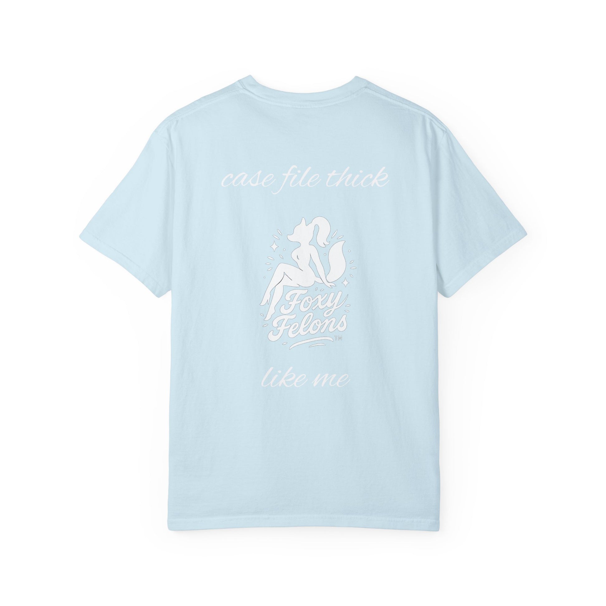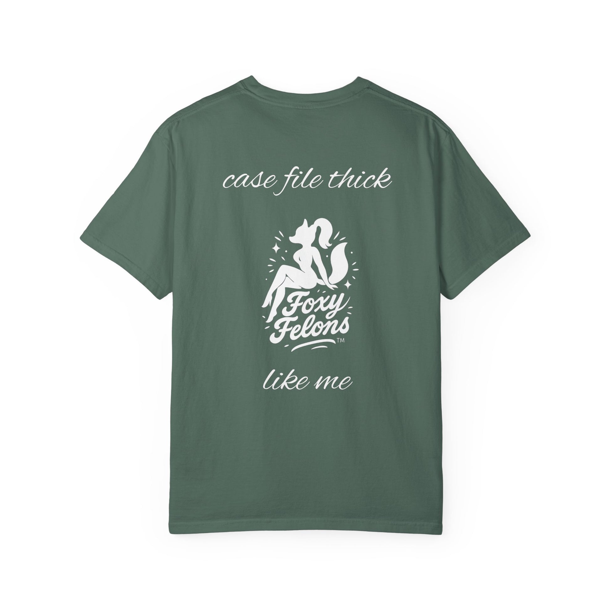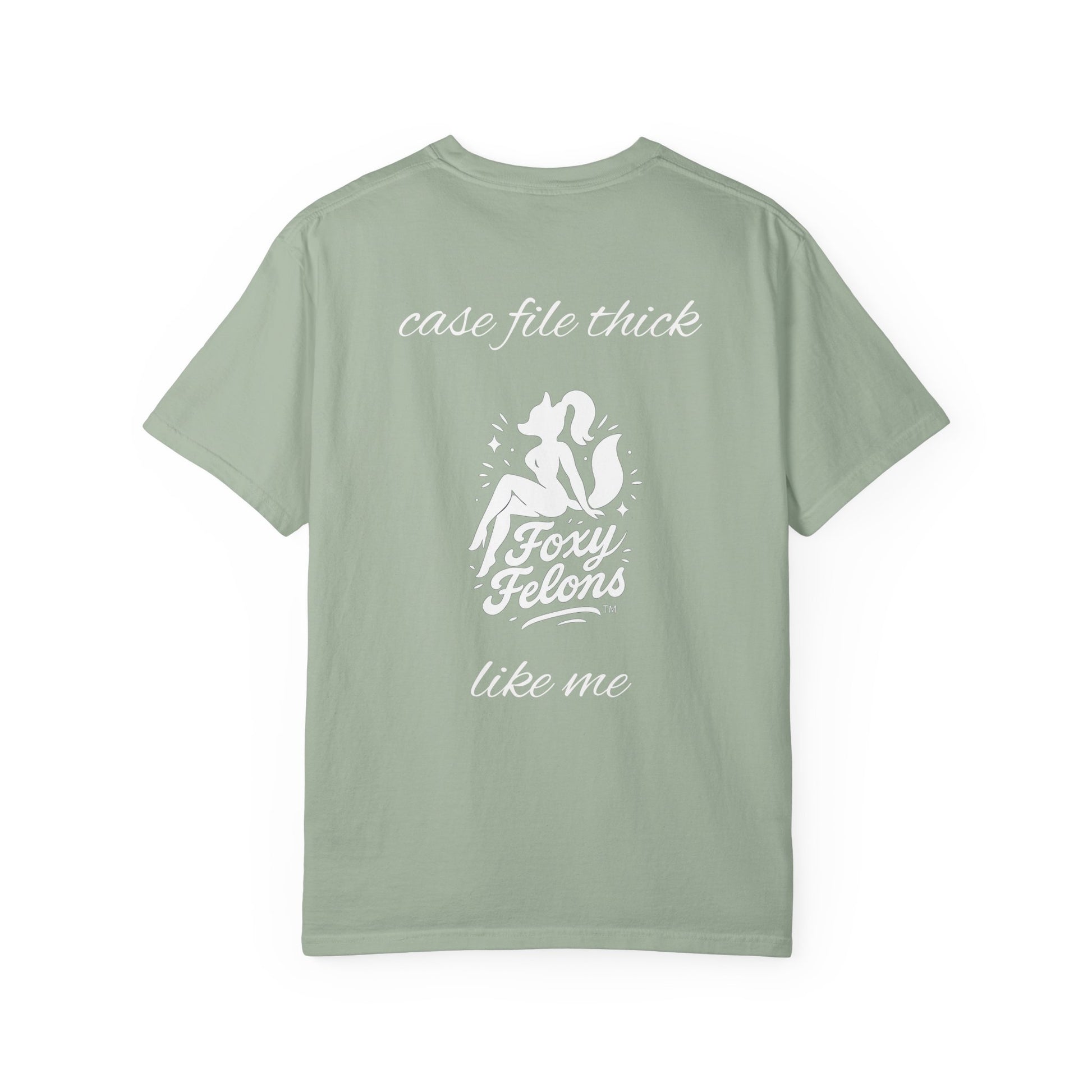 This heavyweight, garment-dyed tee brings a lived-in softness and bold attitude to casual days. The relaxed cut and dense 100% ring-spun cotton feel substantial without stiffness, and the post-construction dye creates a muted, vintage-rich color that won’t look new for long — in the best way. A small chest graphic keeps things subtle up front, while the back reads like a confident anthem with a pinup-style fox silhouette and script: “case file thick / Foxy Felons / like me.” Wear it to lean into a rebellious, witty vibe at shows, late-night drives, or get-togethers with friends who appreciate retro ink and dark humor.